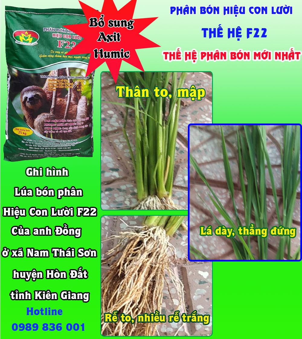 Đặc điểm cây lúa bón Phân Công Nghệ Sinh Học hiệu Con Lười F22 tại ruộng nhà anh Đồng ở xã Nam Thái Sơn, huyện Hòn Đất, tỉnh Kiên Giang: Bộ rễ lúa phát triển, nhiều rễ trắng, rễ to, ăn sâu vào đất, thân to mập, cây cứng, khả năng chống đổ ngã tốt, bộ lá lòng mo, dày lá, góc lá hẹp, sạch sâu bệnh hại.