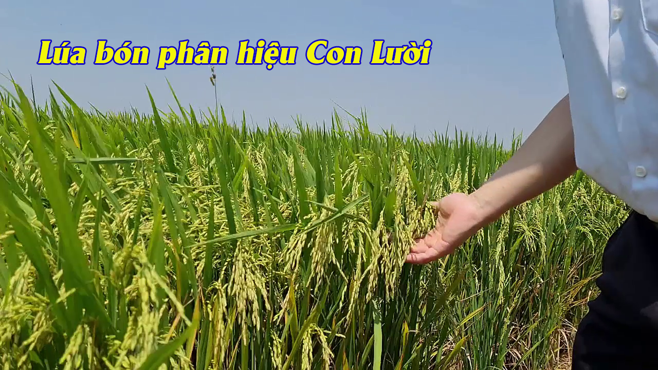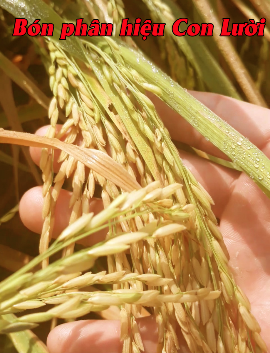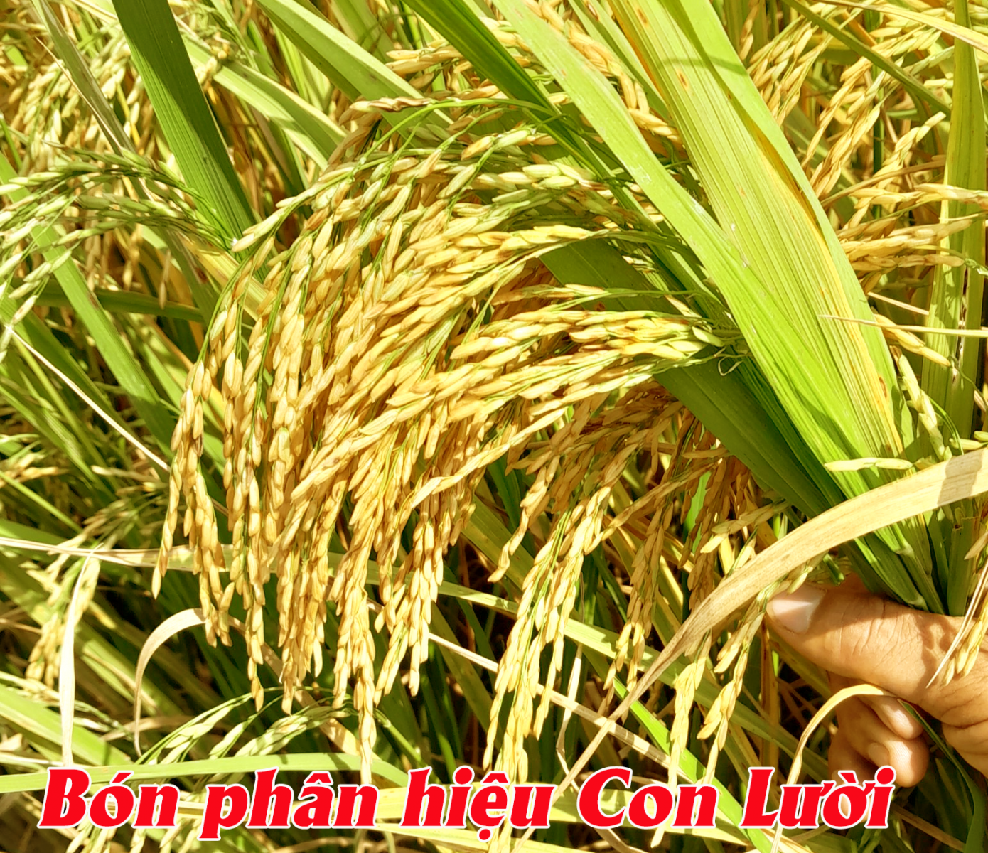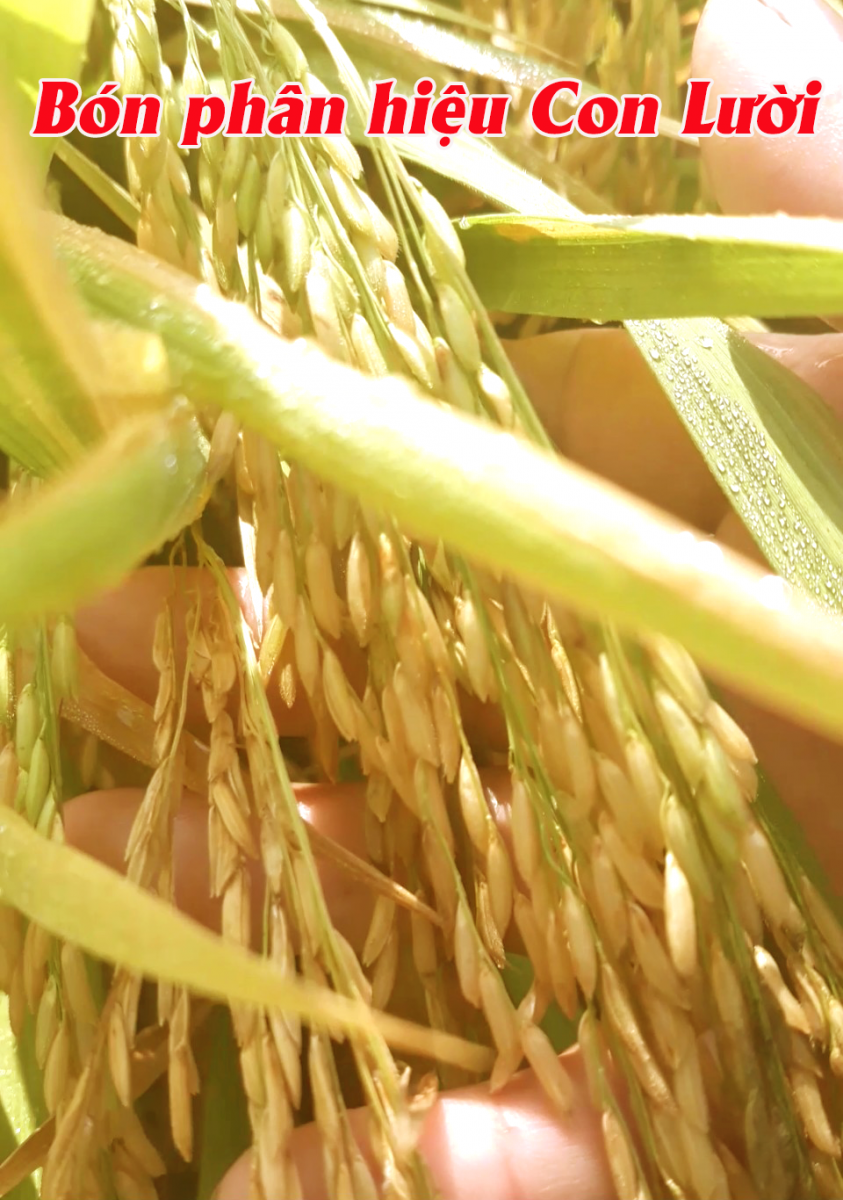 Hình ảnh lúa bón phân hiệu Con Lười của chị Nhung ở huyện Thoại Sơn, tỉnh An Giang trong vụ Xuân 2023: Cây lúa cứng cây chống đổ tốt, bông lúa to dài, hạt vàng óng chắc mẩy tận cậy, chín đồng đều.