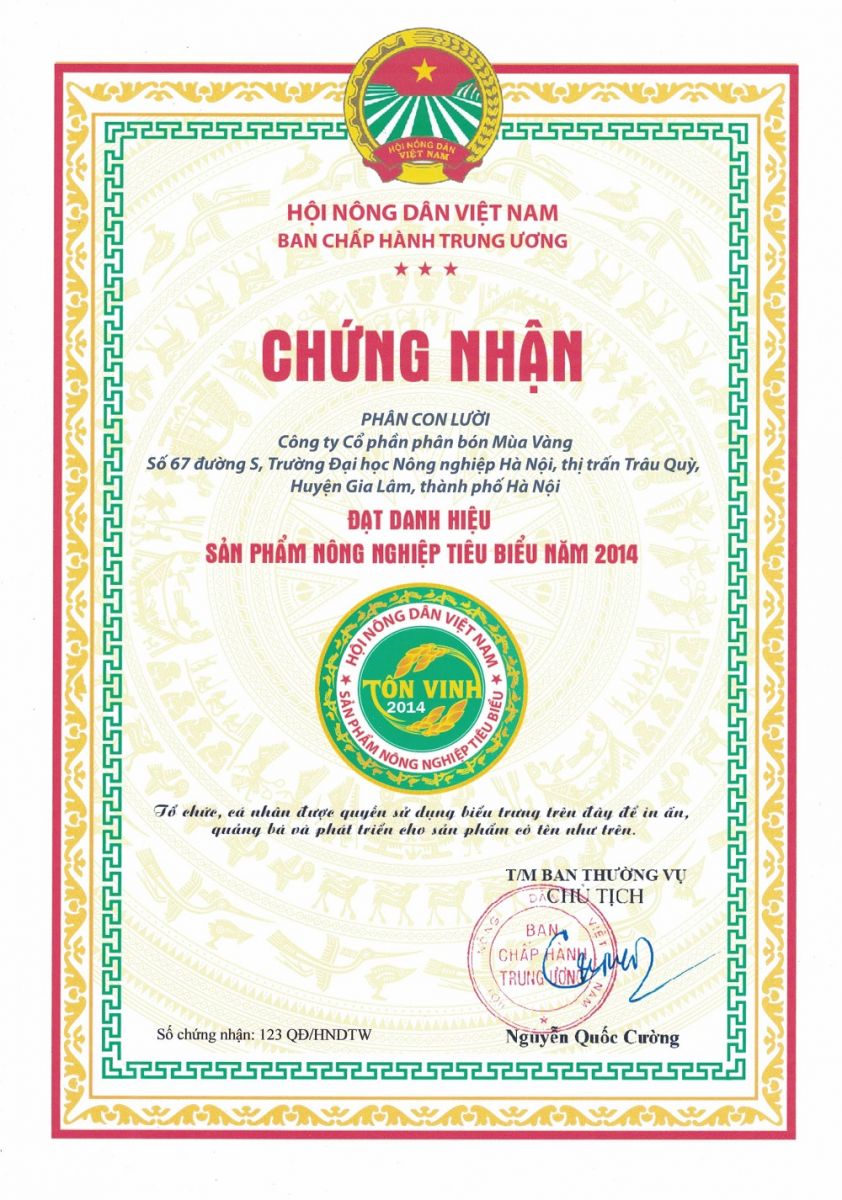Ngày 07 tháng 06 năm 2015 với sản phẩm Phân viên nén nhả chậm NPK 17-5-11 mang nhãn hiệu " Phân Con Lười" , Công ty Cổ phần Phân bón Mùa Vàng đã vinh danh nhận giải thưởng " TÔN VINH SẢN PHẨM NÔNG NGHIỆP TIÊU BIỂU NĂM 2014" do Hội Nông Dân Việt Nam trao tặng. Về phía công ty có Ông Nguyễn Văn Luých - Chủ tịch hội đồng quản trị đại diện cho công ty nhận giải thưởng danh giá này.